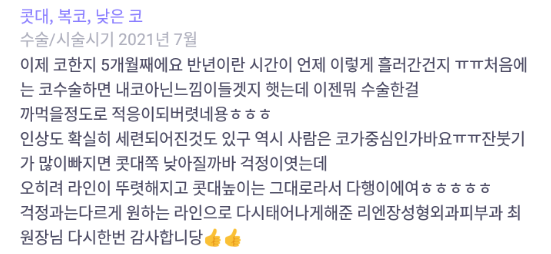 リエンジャン美容外科医院 ★★★★★ 5.0 [바비톡] 코성형 / 5개월차/ 닉네임:둉둉이잉 匿***@ | 2022.01.11 | 30 리엔장성형외과에서 수술 받은 후 강남언니에 업로드한 실제 후기입니다.수술항목: 코성형 口コミ一覧に戻る