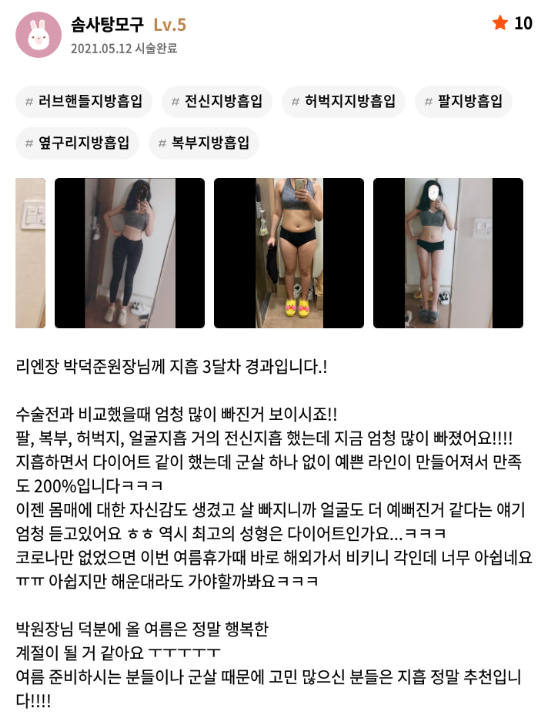 リエンジャン美容外科医院 ★★★★★ 5.0 [강남언니] 전신지방흡입 / 3개월차/ 닉네임:솜사탕모구 匿***@ | 2022.01.11 | 34 리엔장성형외과에서 수술 받은 후 강남언니에 업로드한 실제 후기입니다. 수술항목: 전신지방흡입 ( 팔, 복부, 허벅지) 口コミ一覧に戻る