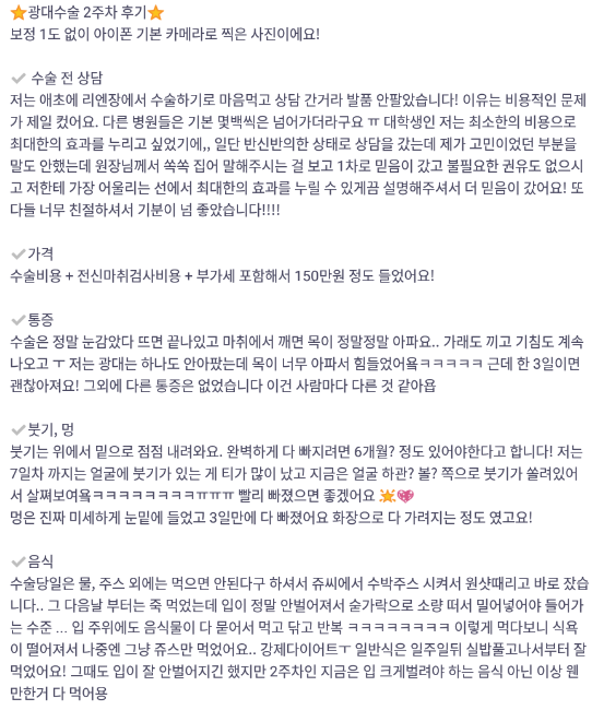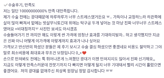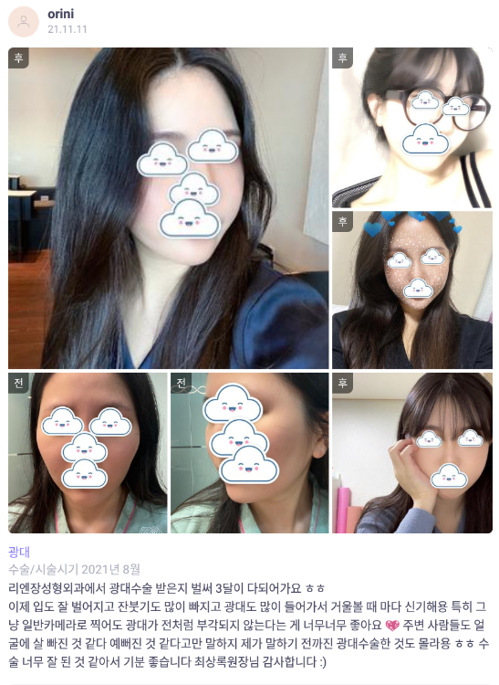 リエンジャン美容外科医院 ★★★★★ 5.0 [바비톡] 안면윤곽 / 3개월차/ 닉네임: orini 匿***@ | 2022.01.18 | 36 리엔장성형외과에서 수술 받은 후 바비톡에 업로드한 실제 후기입니다. 수술항목: 광대축소 口コミ一覧に戻る