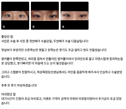 リエンジャン美容外科医院 ★★★★★ 5.0 [강남언니] 자연유착 / 1개월차 / 닉네임 : ㅋㄱㅋㅋㄲ 匿***@ | 2022.03.15 | 33 口コミ一覧に戻る