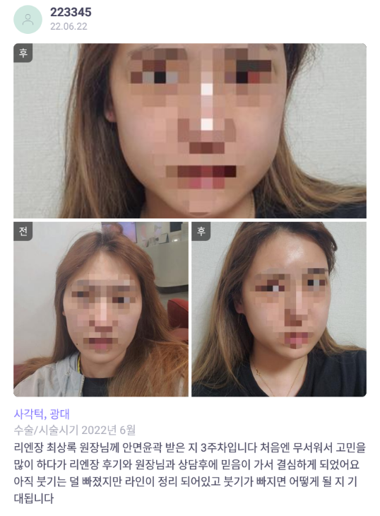リエンジャン美容外科医院 ★★★★★ 5.0 [바비톡] 광대, 사각턱 / 3주차 / 닉네임:223345 匿***@ | 2022.07.08 | 33 口コミ一覧に戻る