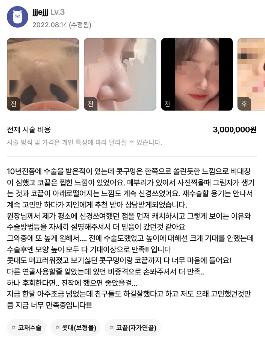 リエンジャン美容外科医院 ★★★★★ 5.0 [강남언니] 코재수술 / 1개월차/ 닉네임: jjjejjj 匿***@ | 2024.05.31 | 33 口コミ一覧に戻る