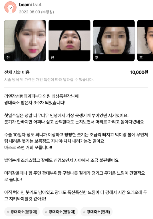 リエンジャン美容外科医院 ★★★★★ 5.0 [강남언니] 안면윤곽(광대) / 3주차/ 닉네임: beami 匿***@ | 2023.01.05 | 35 口コミ一覧に戻る