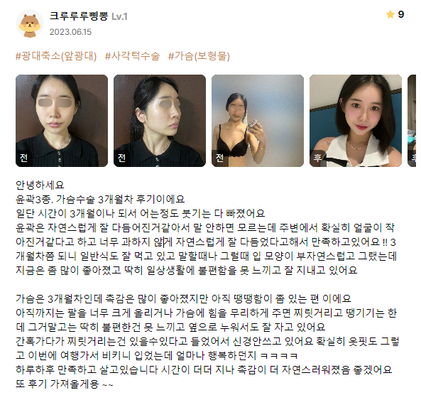 リエンジャン美容外科医院 ★★★★★ 5.0 [강남언니 후기] 윤곽3종(광대,턱끝,사각턱), 가슴(멘토스무스) / 3개월차 / 닉네임:크루루루삥뽕 匿***@ | 2024.03.07 | 32 口コミ一覧に戻る