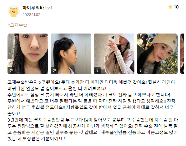 リエンジャン美容外科医院 ★★★★★ 5.0 [강남언니 후기] 코재수술 / 3주차 / 닉네임:하이루익바 匿***@ | 2024.03.07 | 34 口コミ一覧に戻る