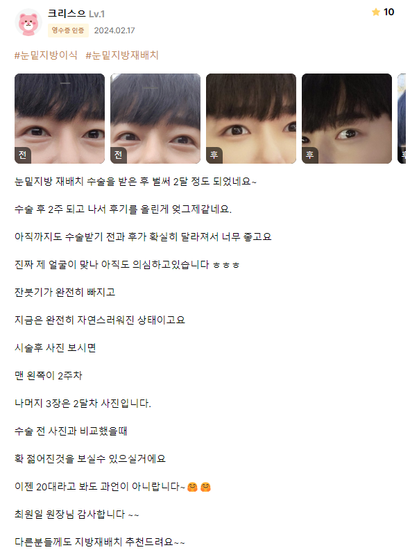 リエンジャン美容外科医院 ★★★★★ 5.0 [강남언니] 눈밑지방재배치 1개월차 / 닉네임 : 크리스으 匿***@ | 2024.03.07 | 29 口コミ一覧に戻る