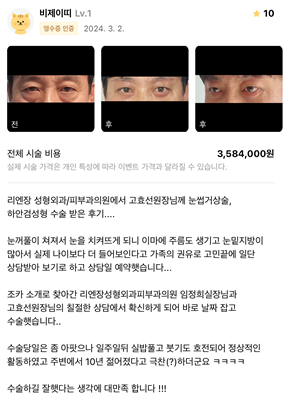 リエンジャン美容外科医院 ★★★★★ 5.0 [강남언니] 하안검, 눈썹거상술 / 1개월차/ 닉네임: 비제이띠 匿***@ | 2024.03.07 | 35 口コミ一覧に戻る