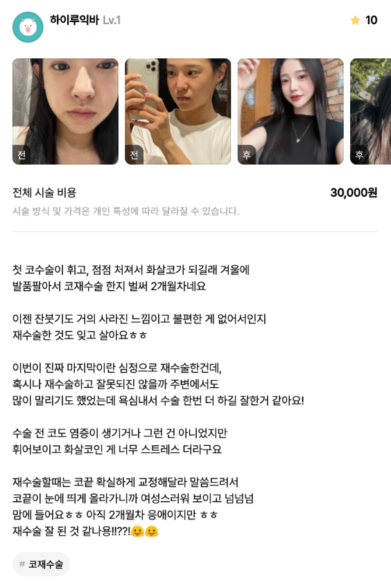 リエンジャン美容外科医院 ★★★★★ 5.0 [강남언니] 코재수술 / 2개월차 / 닉네임 : 하이루익바 匿***@ | 2024.07.04 | 31 口コミ一覧に戻る