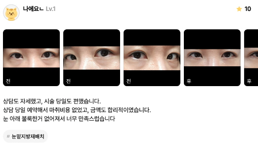 リエンジャン美容外科医院 ★★★★★ 5.0 [강남언니] 눈밑지방재배치 / 1개월차 / 닉네임 : 나에요ㄴ 匿***@ | 2024.07.10 | 36 口コミ一覧に戻る
