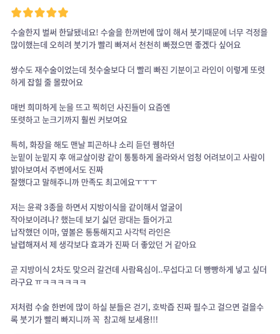 リエンジャン美容外科医院 ★★★★★ 5.0 [바비톡] 윤곽3종, 눈매교정, 쌍꺼풀절개, 눈밑지방재배치, 지방이식(볼, 이마) / 1개월차 / 닉네임: 갱쥐Y8tvn 匿***@ | 2024.08.29 | 33 口コミ一覧に戻る