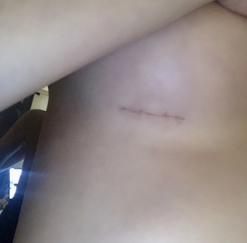 傷口を縫わずにボンドで付けたので、今はとても早く治っているような気がします!?今はボンドが全部剥がれてかさぶたがありますが、もし傷跡が残ったら嫌なので今日から傷跡の軟膏を塗っています。